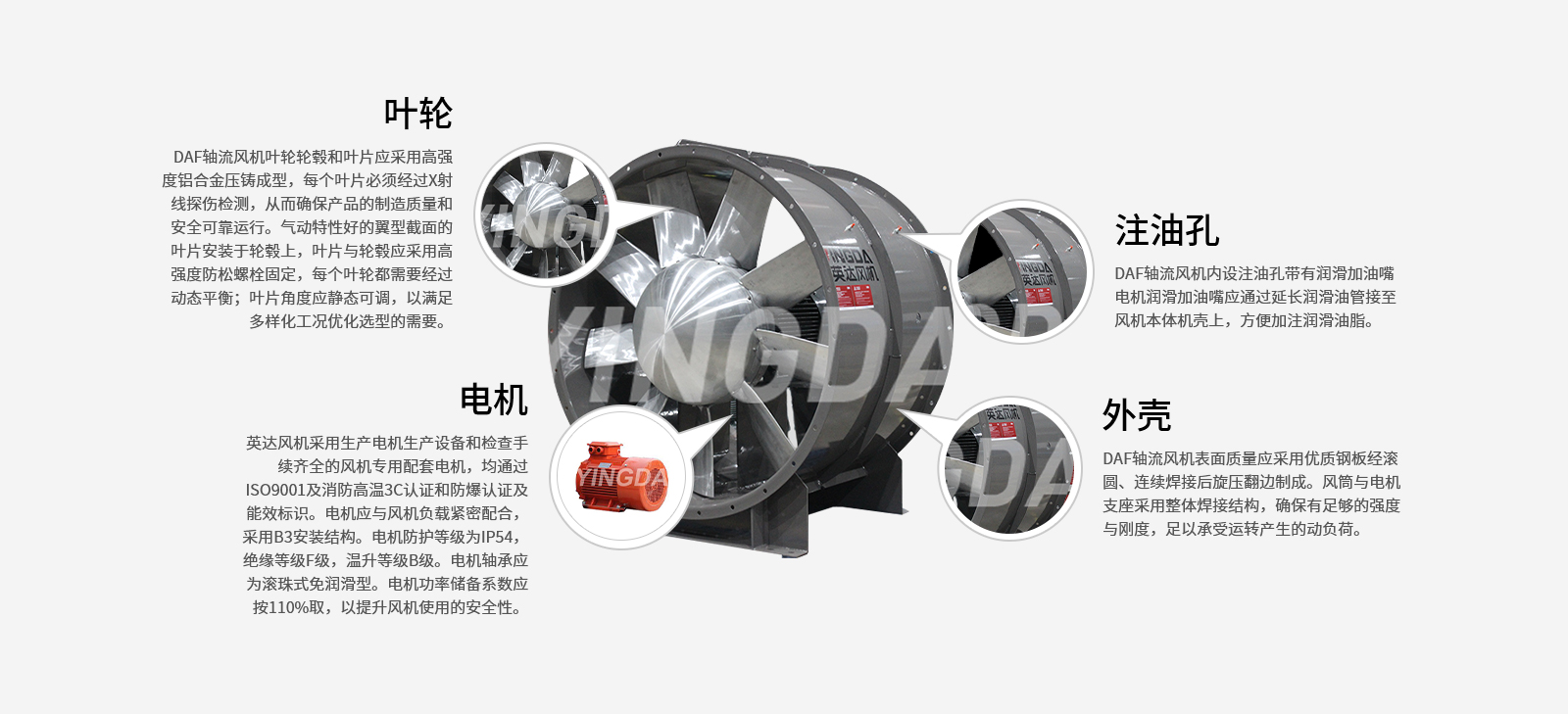 DAF軸流風機內(nèi)設(shè)注油孔帶有潤滑加油嘴電機潤滑加油嘴應通過延長潤滑油管接至風機本體機殼上,方便加注潤滑油脂。