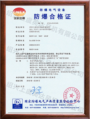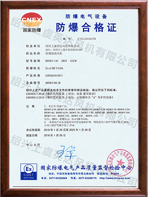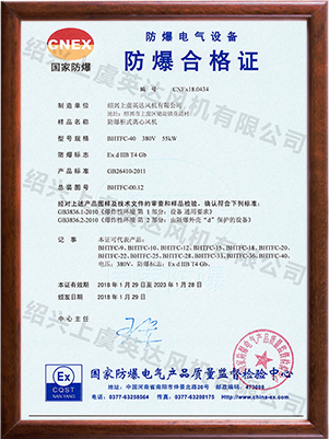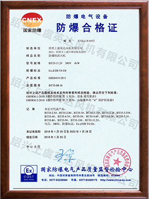 為適應(yīng)防爆環(huán)境需要,風(fēng)機可做成防爆風(fēng)機,防爆等級為EXdⅡBT4,適用于易燃、易爆氣體的場所。整機通過國家防爆認(rèn)證。