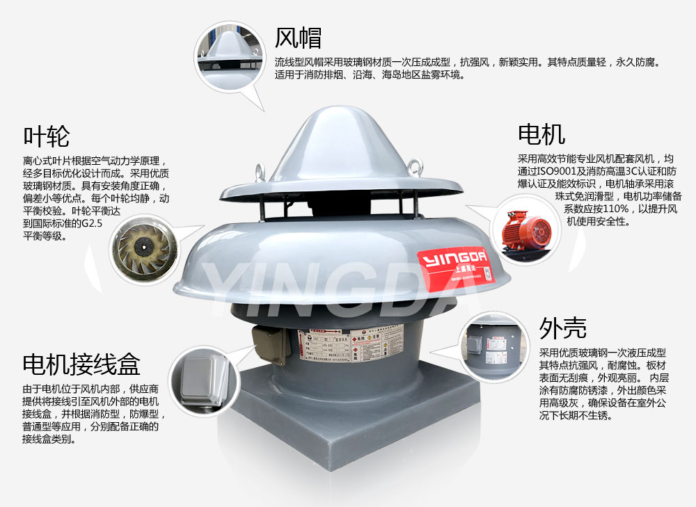 鋼制屋頂風機機殼為鋼板焊接成形,玻璃鋼屋頂風機機殼為玻璃鋼一次成形,風機風帽為玻璃鋼一次成形。