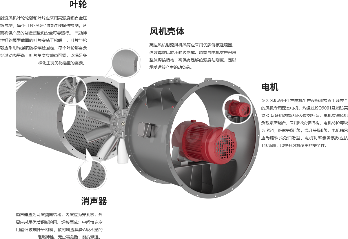 英達風機射流風機風筒應采用優質鋼板經滾圓、連續焊接后旋壓翻邊制成。風筒與電機支座采用整體焊接結構,確保有足夠的強度與剛度,足以承受運轉產生的動負荷。