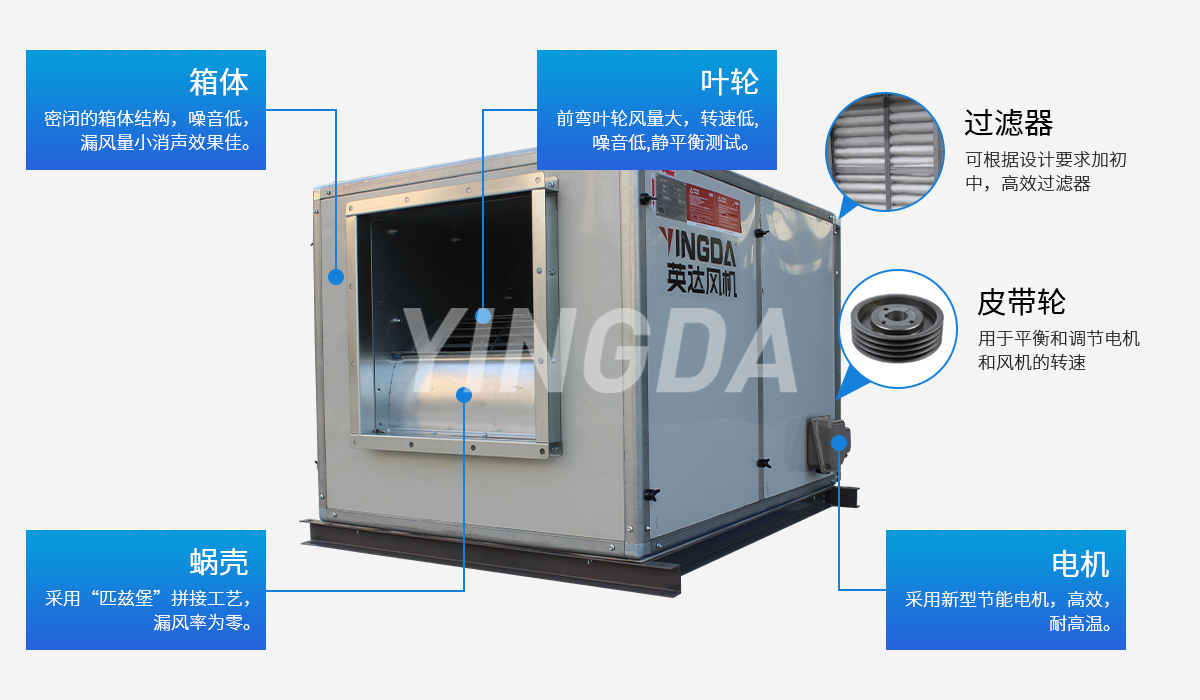 英達風機蝸殼采用流線型雙進風結構,“匹茲堡”拼接工藝,漏風率為零;雙側板一次成型,精度高,減小裝配后尺寸誤差;葉片一次沖壓 成型,專門夾具確保葉片安裝精確定位。